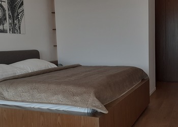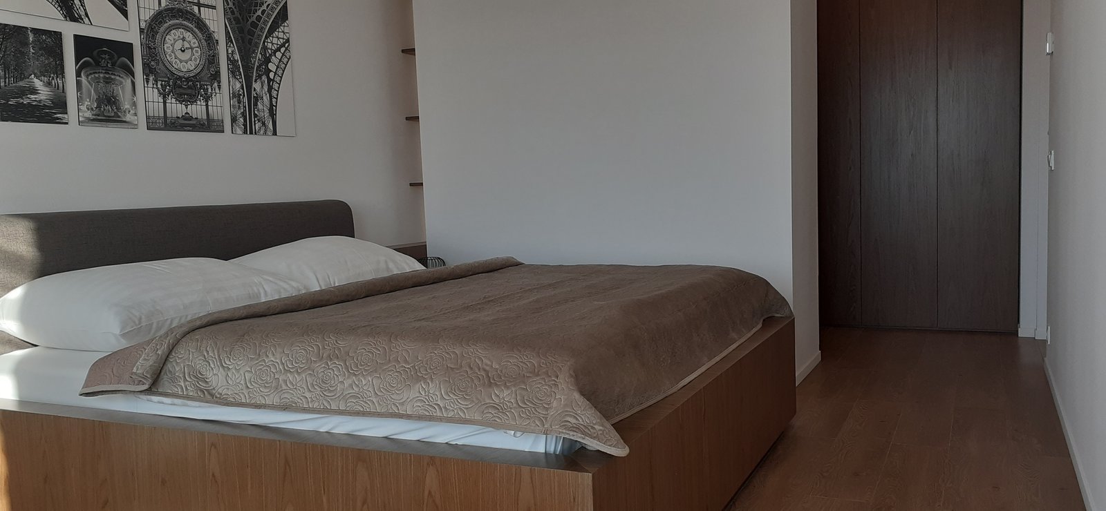 Sypialnia z łóżkiem typu king size 180/200 cm z przestronną garderobą oraz łazienka z kabiną prysznicową. Niewątpliwie wyjątkowym atutem mieszkania jest niesamowity widok na panoramę miasta oraz panoramicznie przeszklone ściany.