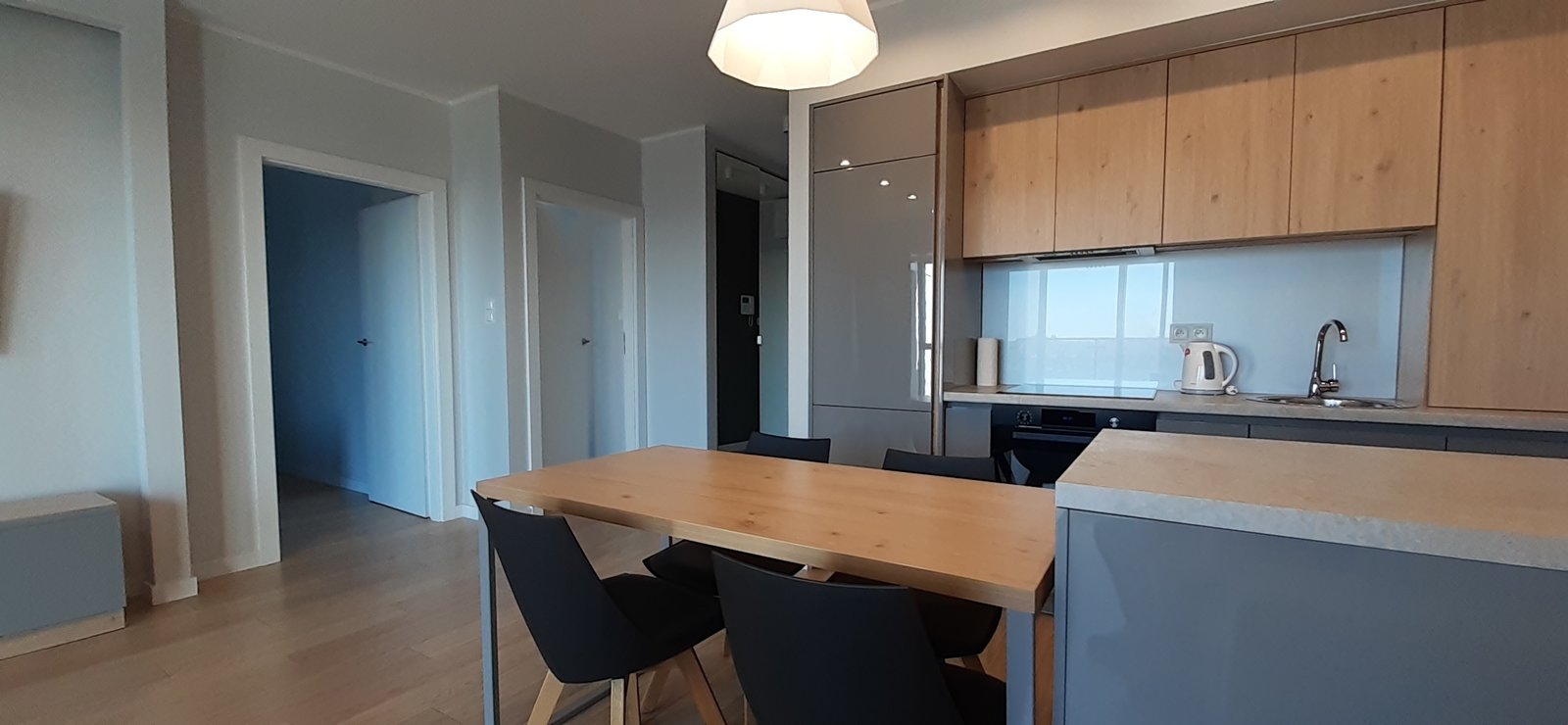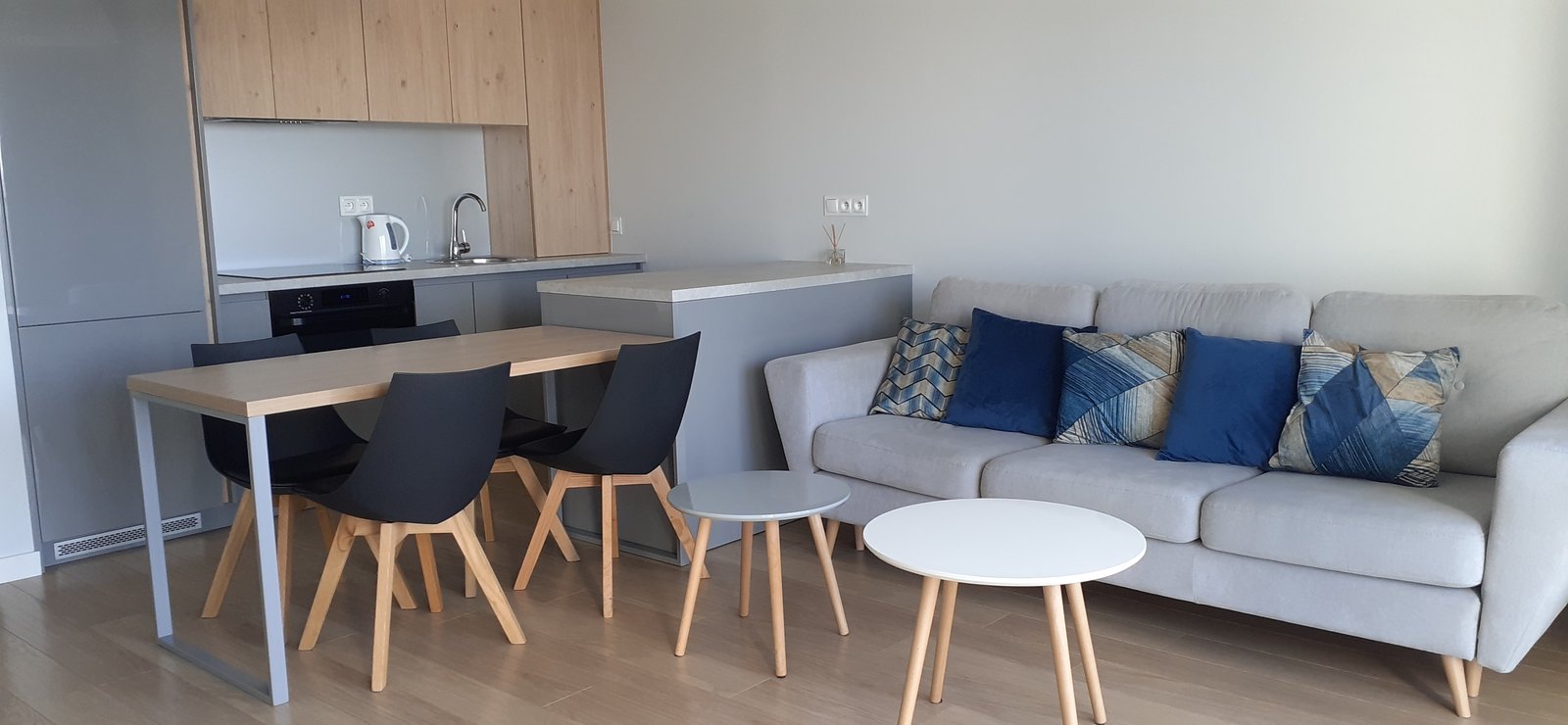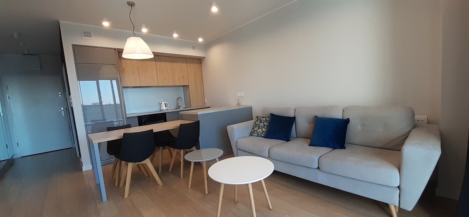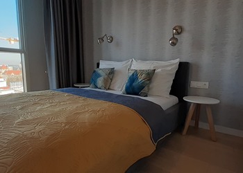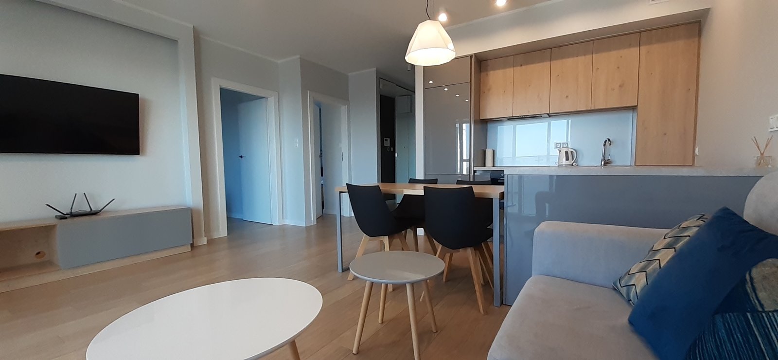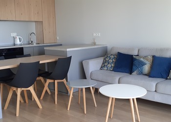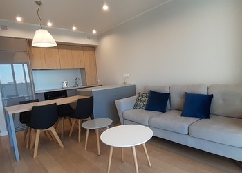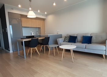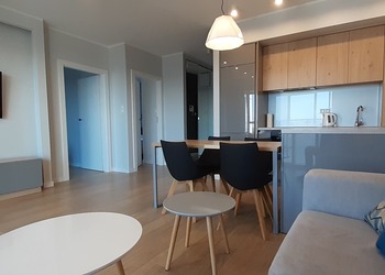 Powierzchnia apartamentu 60 mkw składa się m.in. przestronny salon z aneksem kuchennym wyposażony w sprzęt codziennego użytkowania pyłata ceramiczna, piekarnik, zmywarka, ekspres do kawy itp. dwie sypialnie z podwójnymi łóżkami i łazienka z kabiną prysznicową.