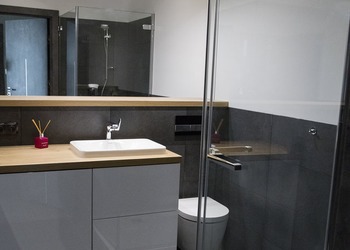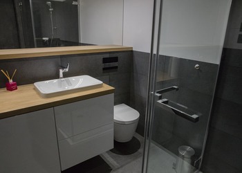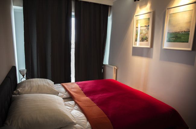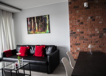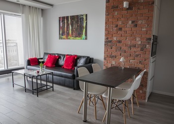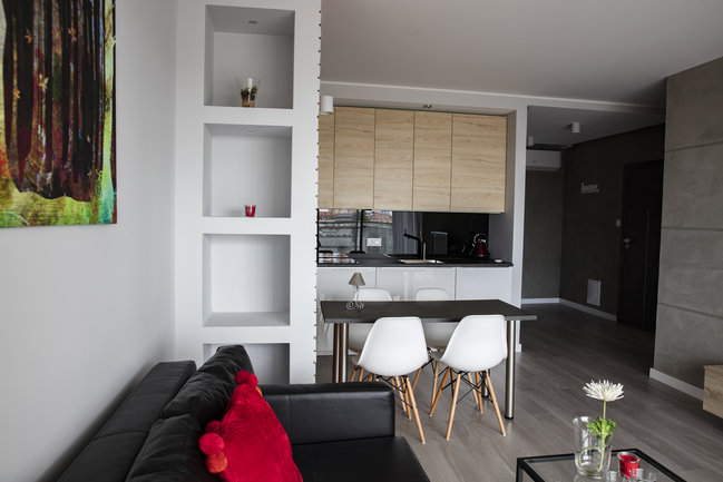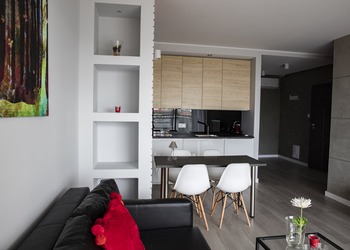 Powierznia apartamentu 55 mkw składa się m.in. sypialnia, łazienka z kabiną prysznicową, przestronny salon z aneksem kuchennym w pełni wyposażony w niezbędny sprzęt codziennego użyku ekspres do kawy, lodówka piekarnik, płyta indukcyjna.