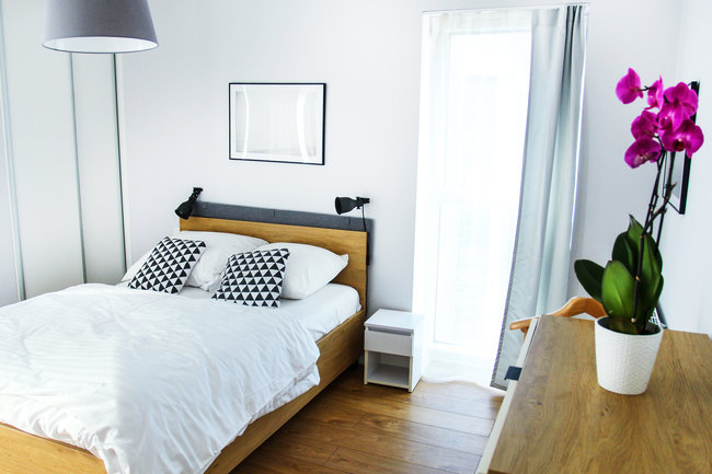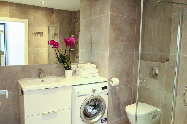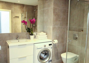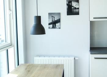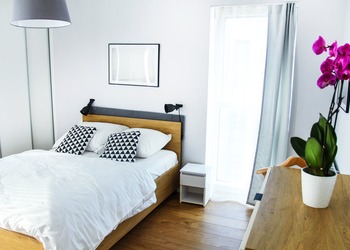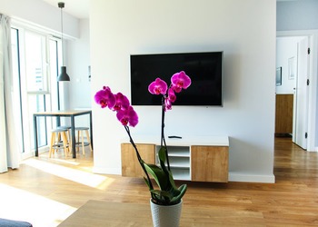 Powierznia apartamentu 55 mkw składa się m.in. sypialnia, łazienka z kabiną prysznicową, przestronny salon z aneksem kuchennym w pełni wyposażony w niezbędny sprzęt codziennego użyku ekspres do kawy, lodówka piekarnik, płyta indukcyjna.